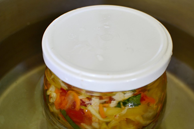 Забравяме за салата за два или три часа, така че зеленчуците да се сприятеляват помежду си, да ги солят и да оставят течността. Пригответе салата (заедно със сока) плътно напълнете стерилните буркани и ги изпратете за стерилизация в тенджера с покрито дъно. Половинлитровите буркани се стерилизират половин час, а на литър минути - 50.