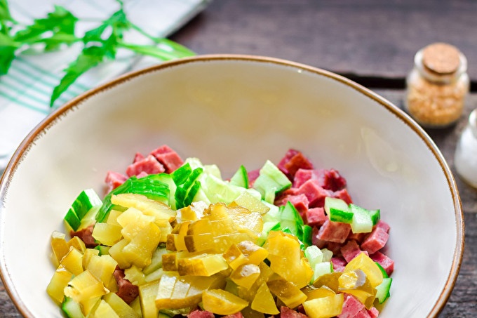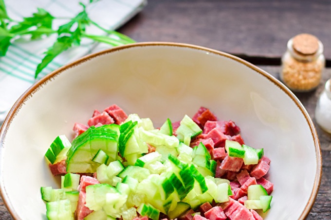 Подгответе всички необходими продукти от списъка. Пушената наденица се нарязва на малки кубчета. Сгънете нарязания колбас в купа за салата. Нарежете преснатата краставица на кубчета и добавете към купата за салата.