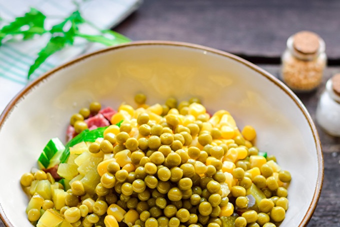 След това отворете буркан с грах, изцедете сока и добавете грах след царевицата. Можете също да добавите съставки от себе си.