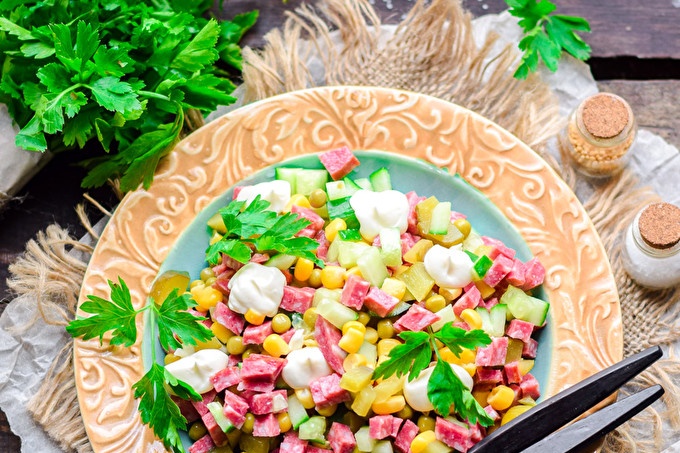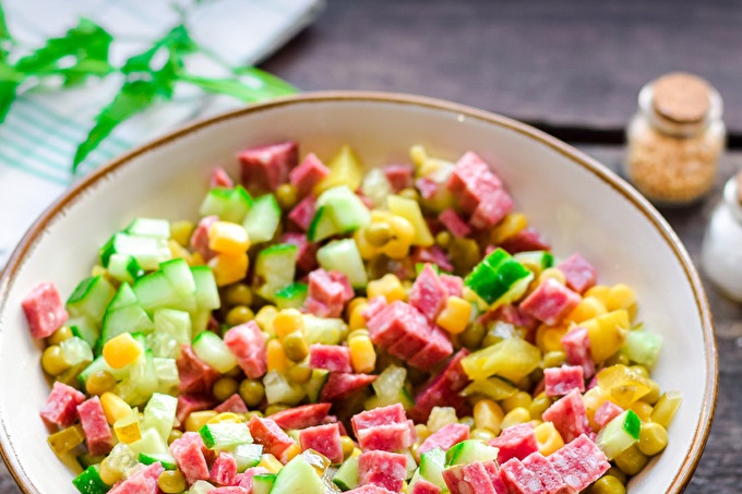 Обичате ли прости салати? Ако отговорът ви е положителен, тогава ви предлагам да подготвите само една прекрасна салата, която не трябва да се приготвя, да се изрязва всичко и да е готова - трябва да се съгласите, звучи изкусително! Салата се оказва много вкусна, сочна. Най-важното нещо е да се избират висококачествени съставки, да се вземат най-висококачествените колбаси, да се туршия пресни и осолени краставици - кисели или ферментирали. Добави тук някои царевица и консерви грах. Ще напълним салата с майонеза, можете да използвате дома или магазина, с добро качество. Салата е идеална дори за празничната маса. Вижте рецептата със снимки стъпка по стъпка.