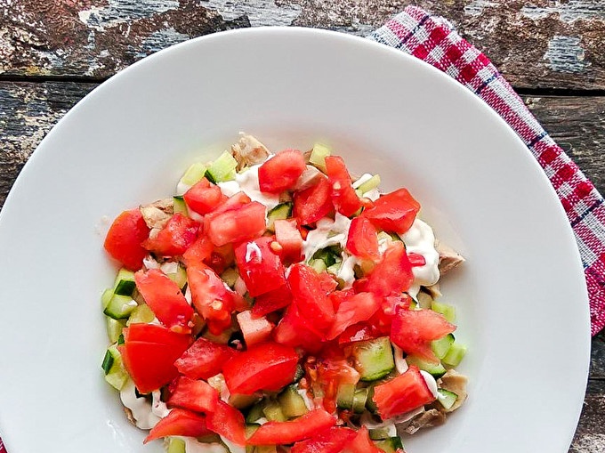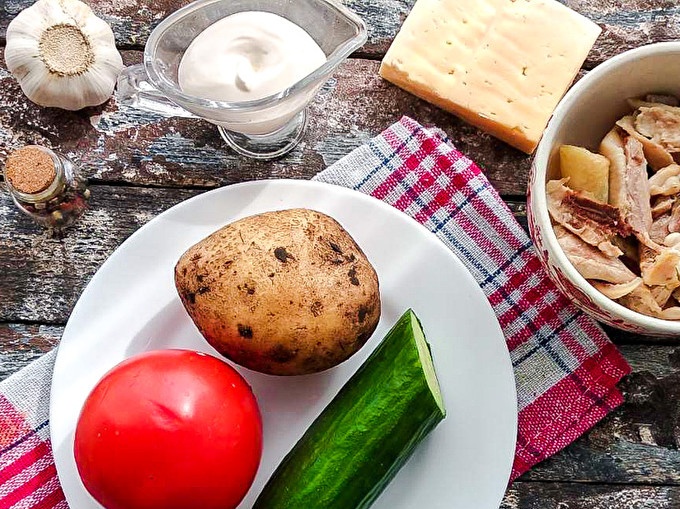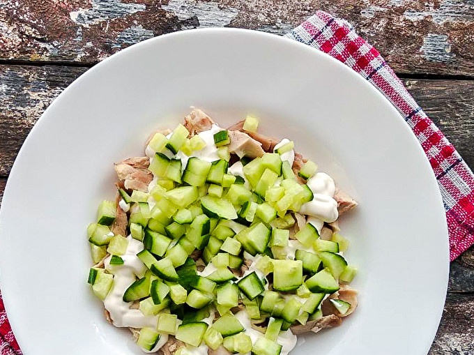 На върха на пилето изрежете нарязани на кубчета краставици, а също и мазнина с майонеза.