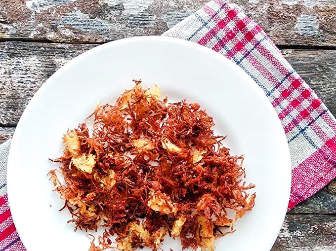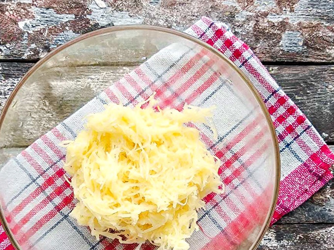 Настърганите картофи се изцеждат добре, за да се натрупа излишък от сок и да се подсушат с хартиени кърпи. Добре сушени картофи, изложени на предварително загрята тиган с растително масло на малки порции. Сложете пържените картофи на хартиени кърпи, за да направите излишното олио.