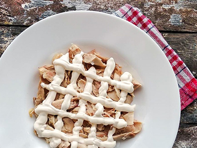 Получаване на салата. Първият слой е направен от сварени гърди и смазани с майонеза.