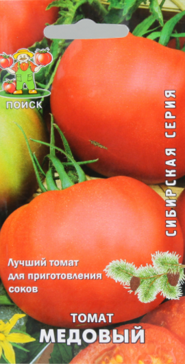 Зреене на хибридна среда. Снимката на торбичка със семена изобразява домати с изразена овална форма. Описанието казва, че плодовете са големи, до 140 g.