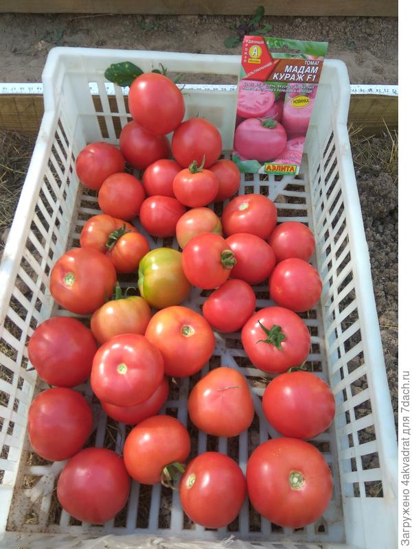 - Мадам Кураж. Ранен, индетерминатен хибрид. Плодовете са закръглени от 120 до 150 g, тъмно розови. Производителност до 19 кг / м². Не съществуват минуси в сорта, от плюсовете - срокът на годност е до 2 месеца, резистентност към кладоспорията. Когато узрее, вкусът се подобрява.