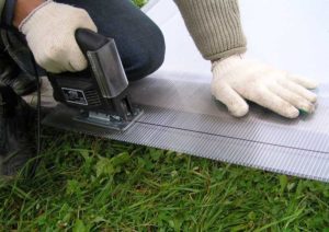 За работа ви е необходим нож за строителство. Ако не е под ръка, вземете електрически пъзел или папка с малки зъби. Ако трябва да работите с тънки листове от поликарбонат, тогава те се поставят върху лист от дебел картон. До десетина листа поликарбонат се поставят върху него за последващо рязане. Процедурата е следната: