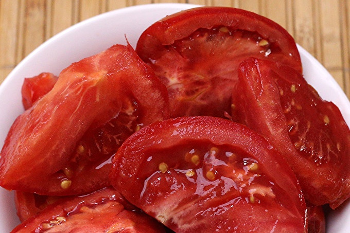 Не е необходимо да отстранявате кожата от доматите, но ако искате да направите хомогенен сос, първо налейте горещата вода върху доматите, отстранете кожата и след това нарязани на четвъртинки.