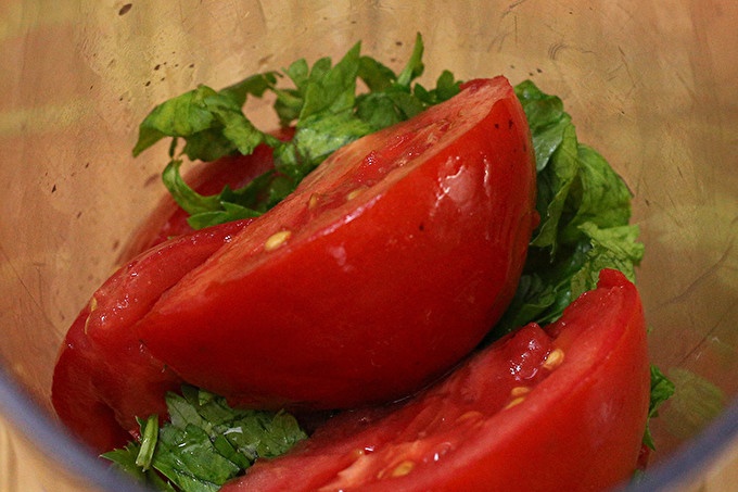 Готовите домати заедно с нарязания босилек се поставят в блендер. Мелене в картофено пюре.