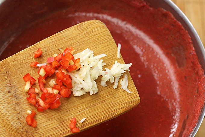 Нарязани на малки парченца лют червен пипер, чесънът се втрива през ренде. След варене, сосът се вари 10-15 минути, добавят се черен пипер и чесън. Пригответе соса още десет минути или повече, в зависимост от желаната дебелина.