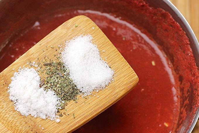 В края на готвенето добавете сол, захар и провансалски билки (вместо това можете да сложите черен пипер или сух босилек). Дайте соса да къкри за няколко минути, опитайте го.