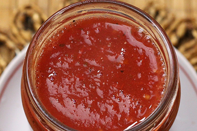Стерилизирайте бурканите с обем 250-300 мл. на пара или печено във фурна. Напълнете с кипящ сос, завъртете капачките.