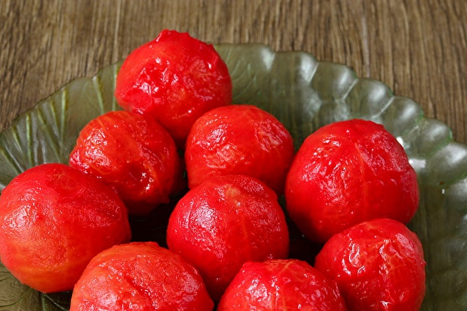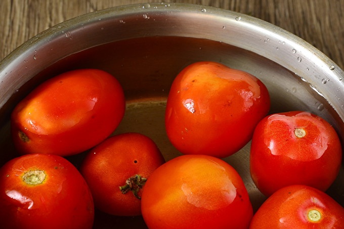 Измиваме доматите, правим малки кръстосани срезове върху тях и ги сгъваме в удобен контейнер. Напълнете ги с вряща вода за 8-10 минути.