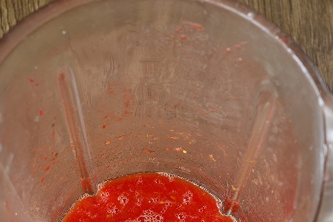 Прекъсваме белени домати с блендер. Ако много домати, тогава ги обработваме в блендер с малки посещения.