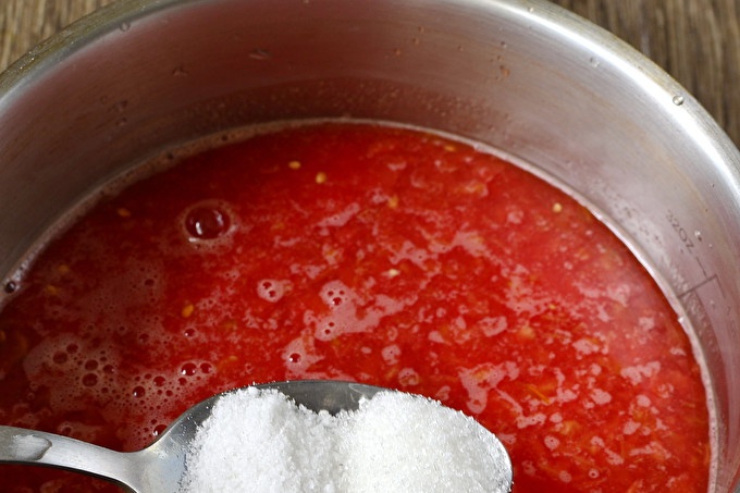 Изсипете цялото прясно доматено пюре в обикновена тенджера. Налейте един литър супена лъжица захар и сол.