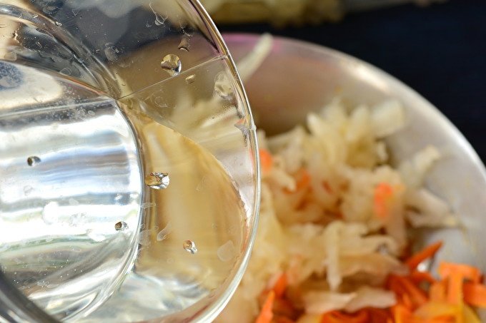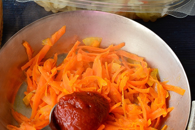 Ако желаете, добавете всеки доматен сос. След 5 минути завършете топлинната обработка на растителната смес и я комбинирайте с зелето. Изсипете с преварена вода.