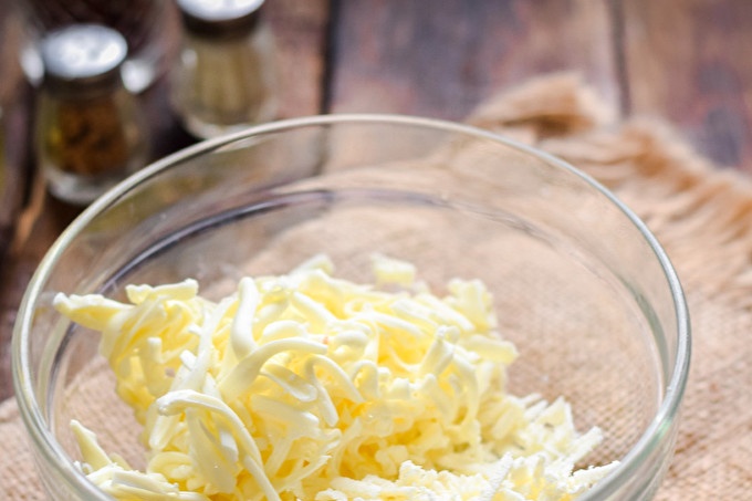 Подгответе всички необходими съставки от списъка. Настържете два вида сирене - твърди и разтопени. Разтопено сирене може да се използва с добавки. Сиренето се настъргва на средна решетка. Сгънете чиповете на сиренето в купа.