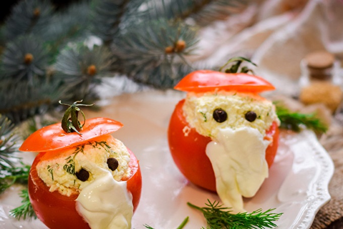 Коледна закуска "Дядо Коледа" от пресни домати, сирене и чесън