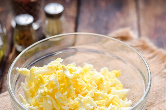 Сварете яйце сварено, след това охладете в студена вода и почистете. Настържете яйцето със средни стружки и добавете към сирената.