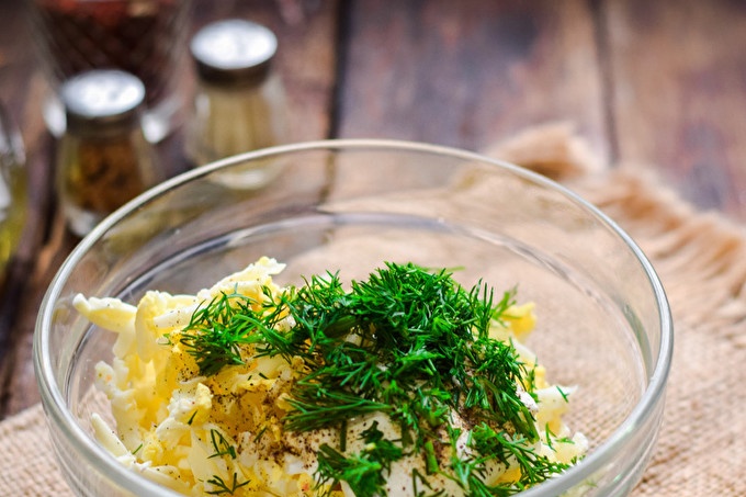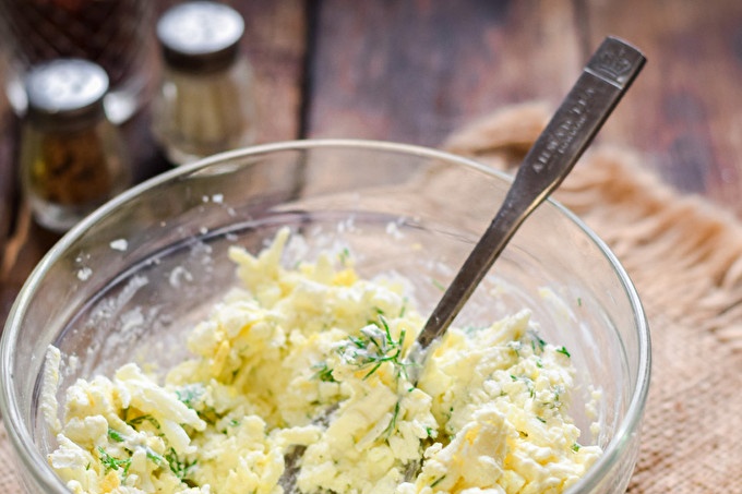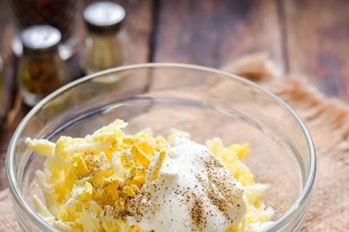 Добавете карамфилче чесън към сиренето, пропуснато върху пресата. Добавете една супена лъжица майонеза в пълнежа, добавете сол към пипера на вкус.