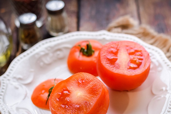 Измийте и изсушете доматите, отрежете доматите.