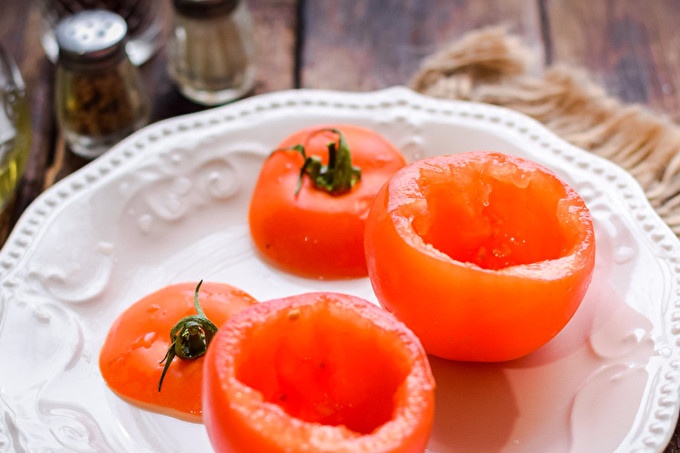 Отстранете ядрата от доматите, така че да завършат с празни бъчви.