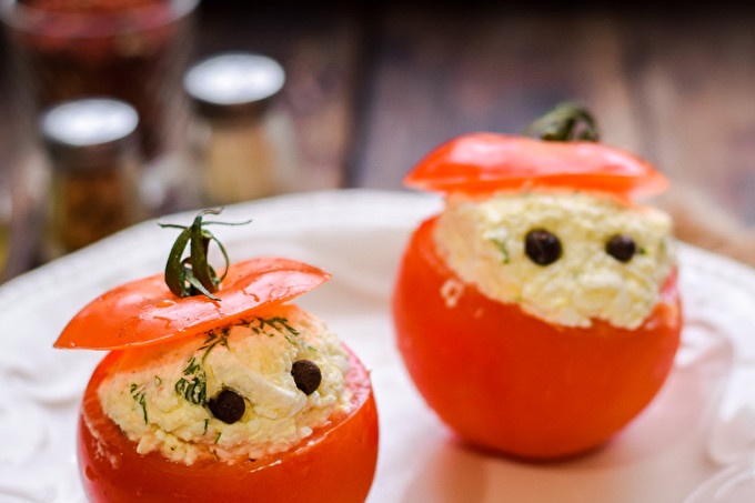 Доматите се пълнят с варено сирене. Покрийте доматите с шапки, добавете декор - очите могат да бъдат направени с пипер.