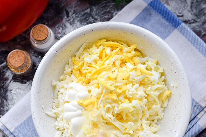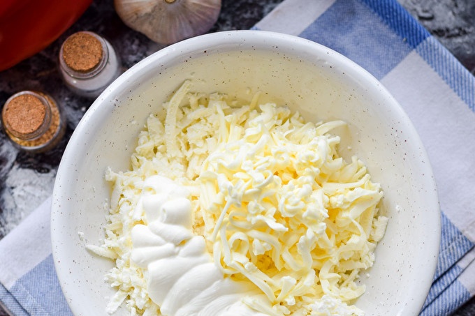 Разтопеното сирене се настъргва по същия начин - на средна ренде, добавя се сиренето в контейнер, добавя се заквасена сметана. Заквасена сметана може да бъде заменена с домашно приготвена майонеза.