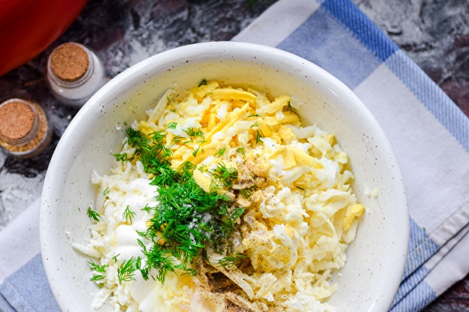 Сварете пиленото яйце, сварено, след това го охладете и обелете, настържете. Обелете чесъна, прескочете върху пресата и добавете към сирената.