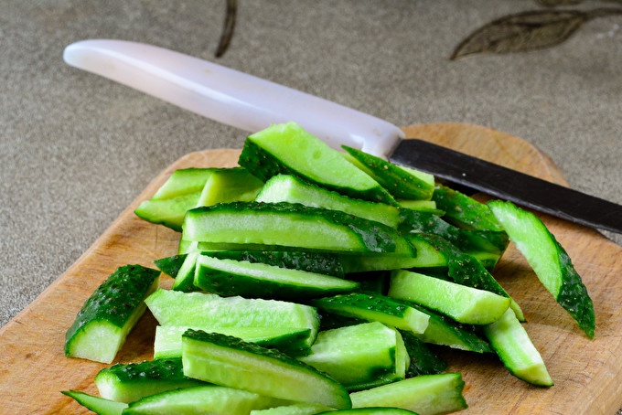 Моите краставици, нарязани на опашки, нарязани на кубчета.