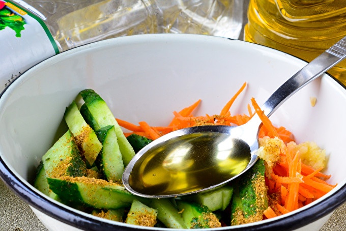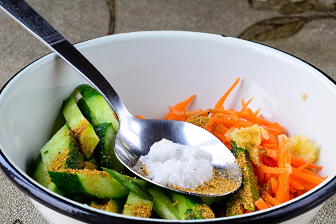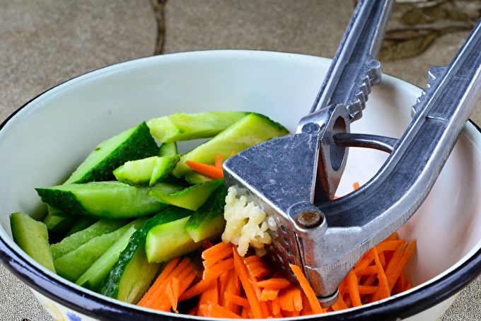 Поставяме краставици в купа и добавяме други съставки: три моркови на корейска ренде и изстискваме чесън (белени скилидки) чрез преса.